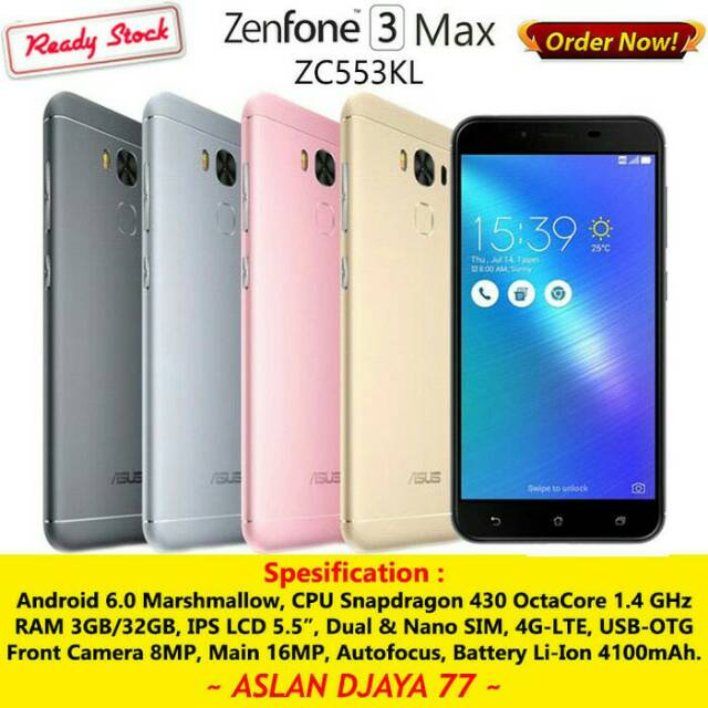 Jual Hp Asus Zenfone 3 Max Zc553kl Online Kualitas Branded, Terbaik & Original, Harga Produk Murah dengan Promo & Diskon, Beli di Bliblicom Gratis OngkirAsus Zenfone 3 Max ZC553KL (Glacier Silver, 32 GB) Rp 1 penawaran lain dimulai dari Rp Asus Zenfone 3 Max ZC5TL (Titanium Grey, 32 GB)SINYALMAGZcom – Asus resmi meluncurkan seri ZenFone 3 Max ZC553KL pada awal tahun 17 lalu Kala itu, smartphone ini hadir menyasar ke segmen kelas menengah dengan harga yang terjangkau Keunggulan Asus ZenFone 3 Max terletak pada baterainya Di mana smartphone ini hadir dengan daya baterai yang cukup besar